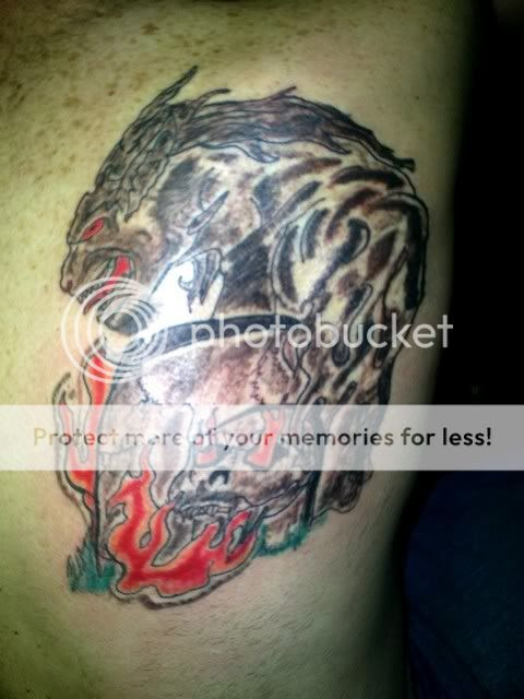 This is the best hellhound-in-a-graveyard EVER, but only because he has a really wicked goatee. I think it is from Big Dogz Ink. The skull looking woefully upwards is a great bonus.